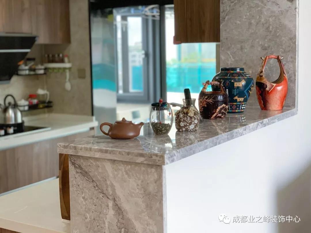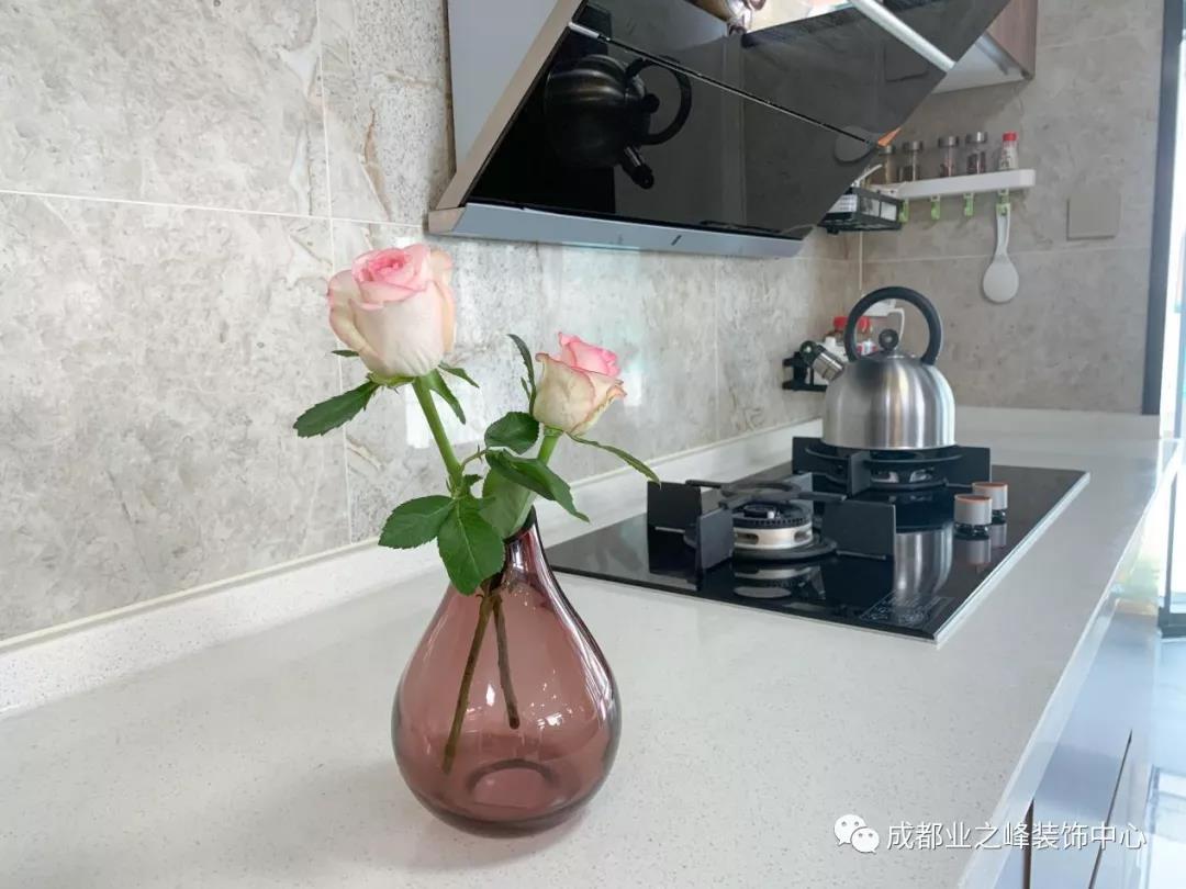 刚才已经介绍过厨房的玄妙,这样再看,整个厨房还是采用西式的开放式厨房设计。注重生活品质的黄姐将这里收拾的井井有条,石材和木材的简约搭配让人浑身舒爽,平日黄姐和先生就是在这样舒适的小厨房准备美食。